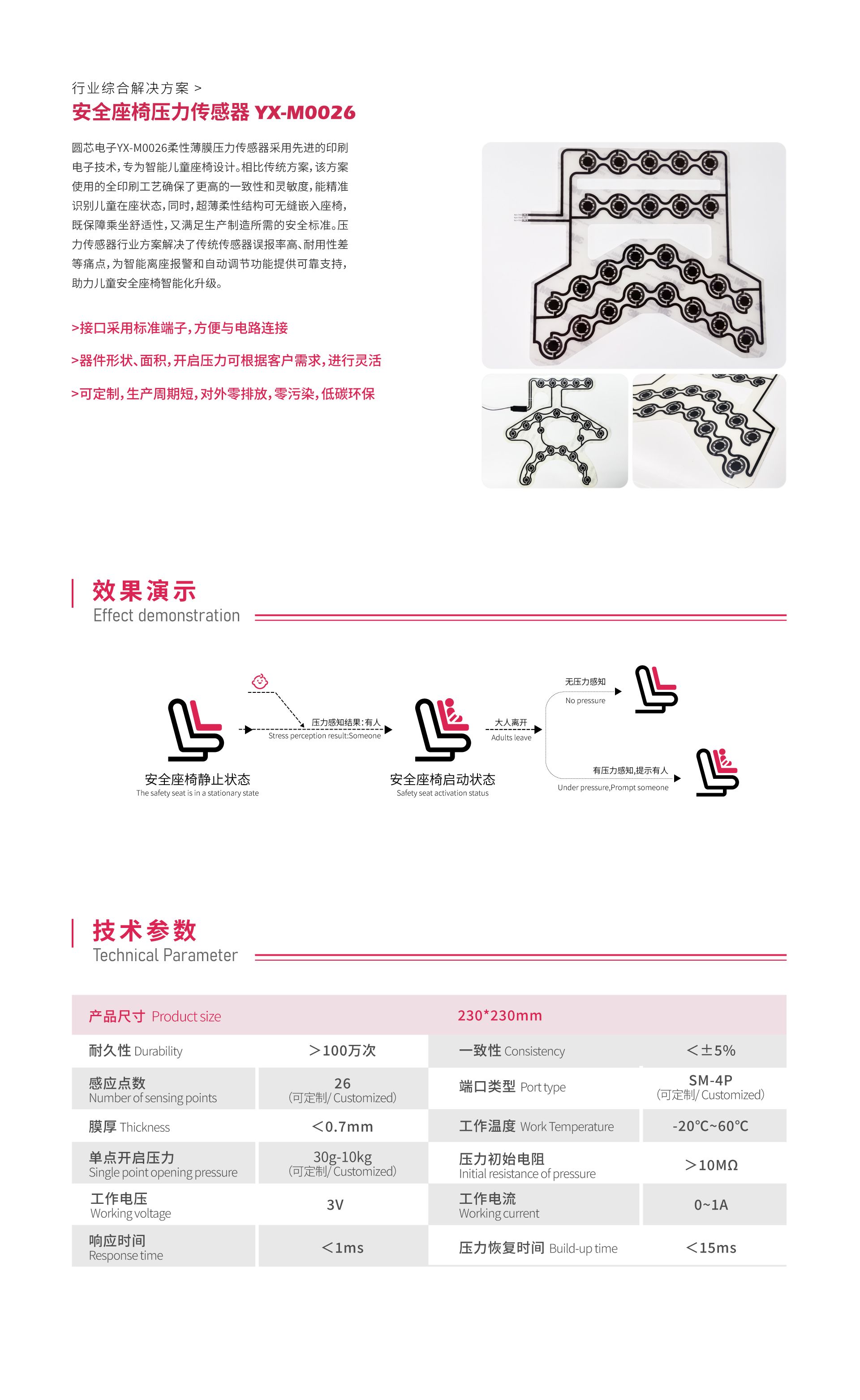 圆芯电子YX-M0026柔性薄膜压力传感器采用先进的印刷电子技术,专为智能儿童座椅设计。相比传统方案,该方案使用的全印刷工艺确保了更高的一致性和灵敏度,能精准识别儿童在座状态,同时,超薄柔性结构可无缝嵌入座椅,既保障乘坐舒适性,又满足生产制造所需的安全标准。压力传感器行业方案解决了传统传感器误报率高、耐用性差等痛点,为智能离座报警和自动调节功能提供可靠支持,助力儿童安全座椅智能化升级。