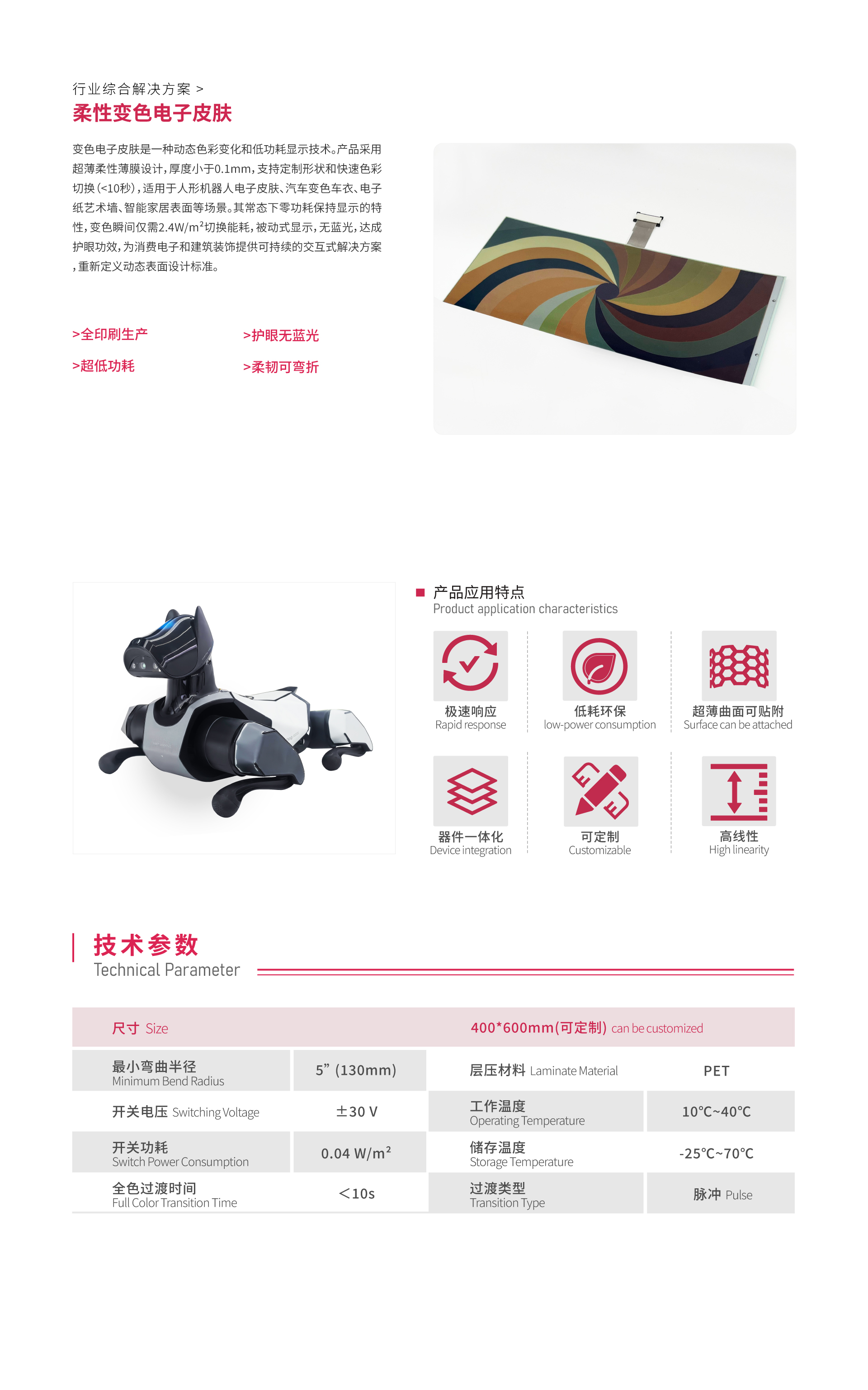 变色电子皮肤是一种动态色彩变化和低功耗显示技术。产品采用超薄柔性薄膜设计,厚度小于0.1mm,支持定制形状和快速色彩切换(<10秒),适用于人形机器人电子皮肤、汽车变色车衣、电子纸艺术墙、智能家居表面等场景。其常态下零功耗保持显示的特性,变色瞬间仅需2.4W/m²切换能耗,被动式显示,无蓝光,达成护眼功效,为消费电子和建筑装饰提供可持续的交互式解决方案,重新定义动态表面设计标准。